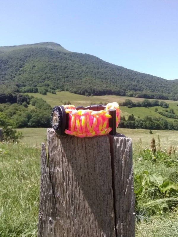 Ce bracelet est composé d'environ 4 mètres de paracorde, une boussole, une pierre à feu, et un sifflet.